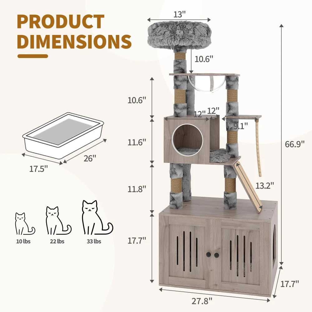 😻😻 66.9" Cat Tree with Litter Box Enclosure – Modern Cat Tower with Storage Cabinet & Multi-Layer Activity Areas