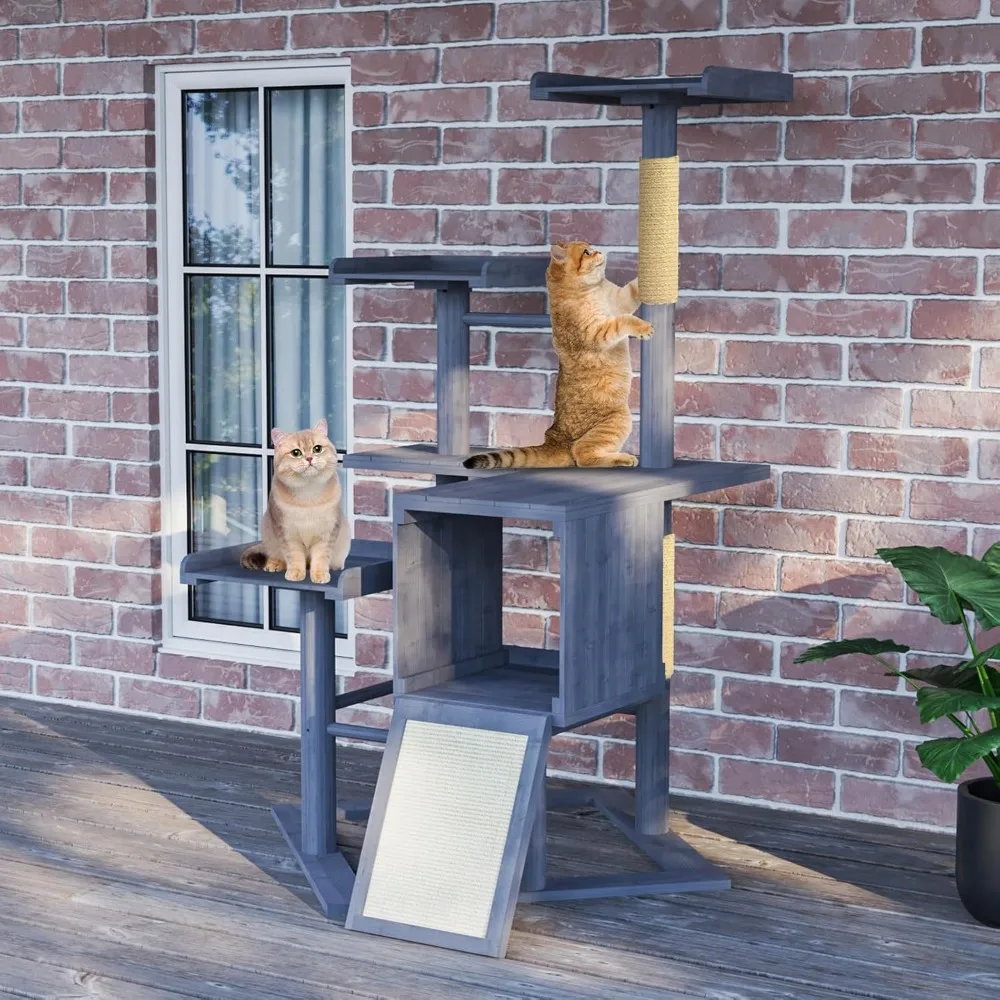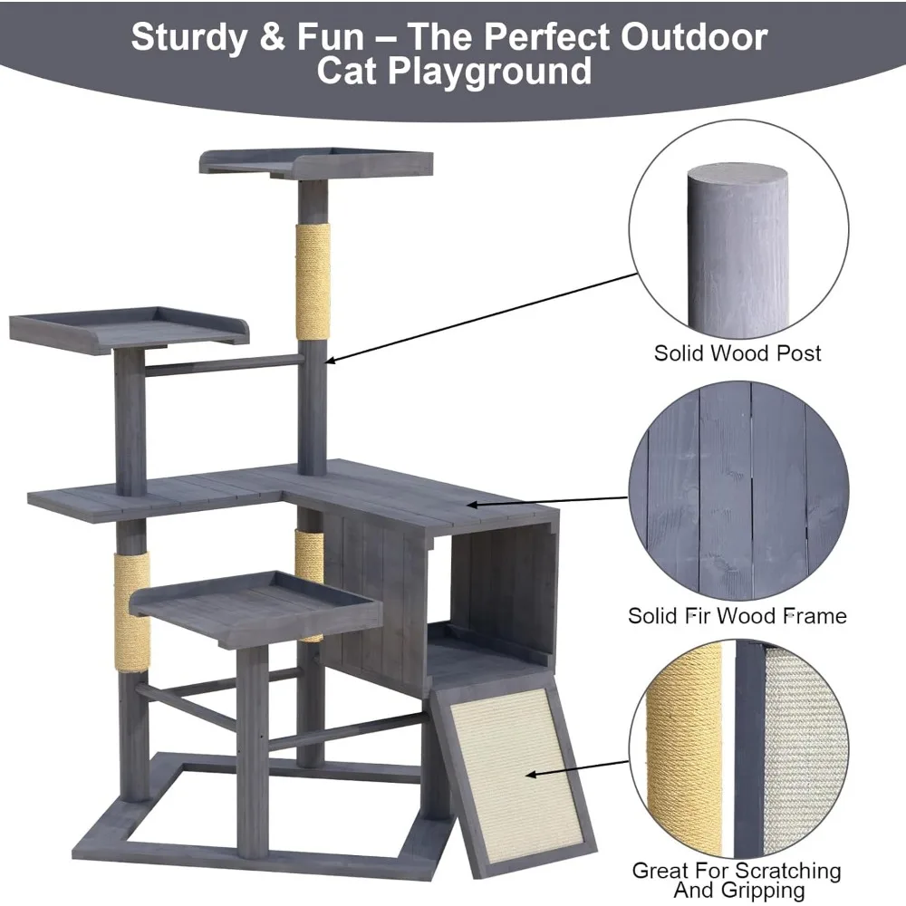 • All-Weather Solid Spruce Craftsmanship: Built from solid spruce wood and sealed with an eco-friendly grey outdoor coating to resist sun, rain, snow, and temperature swings, giving your cat a playground that thrives year-round on the patio or in the yard.