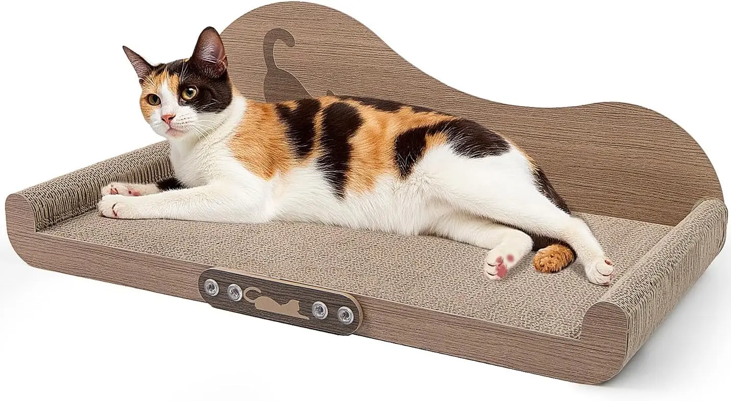 Dual Function Cat Furniture: Combines a scratcher and cozy bed design to save space. This cat scratching board bed satisfies natural scratching instincts and provides a comfortable nap spot.